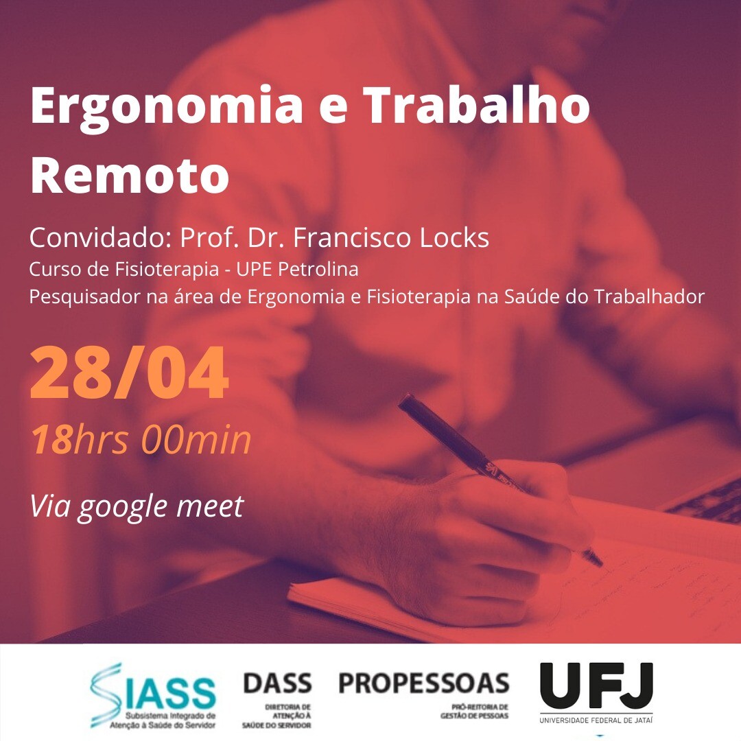 Convidamos a comunidade acadêmica para participar da Palestra Online ''Ergonomia e Trabalho Remoto'' ministrada pelo Prof. Dr Francisco Locks, pesquisador na area de Ergonomia e Fisioterapia na Saúde do Trabalhador da UFPE.